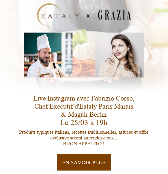 A partir du 25 mars : un article dédié intégrant une remise exclusive aux lectrices de Grazia de 10% sur leur panier sera proposé. Elle sera appliquée du 25 mars au 5 avril sur le site e-commerce, et du 26 mars au 5 avril 2021 en caisse au marché Eataly Paris Marais.